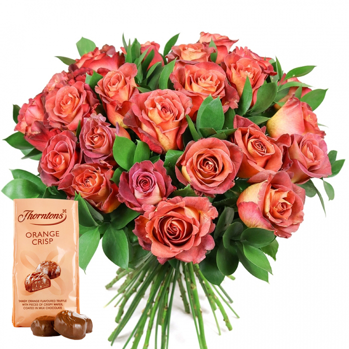 A vibrant, expertly arranged Islington bouquet of fresh roses commands the image, set against a crisp white background that highlights every nuance of colour. Each rose blooms in a rich gradient; soft peach and warm golden orange at tightly coiled centres spill out into striking coral, powder pink, and deep reddish-orange towards the ruffled edges, producing a captivating bi-colour effect. The plush, velvety petals are densely gathered for an opulent appearance, with abundant, dark green foliage-possibly ruscus or eucalyptus-woven between, enhancing the bouquet's vitality and depth. This flourish of green hints at the elegant gardens bordering Highbury & Islington. The neat, hand-tied stems trail beneath the floral dome, furthering the sense of expert craftsmanship and freshness from local flower markets. To the lower left, a refined Thorntons Orange Crisp chocolate pouch stands upright, its creamy wrapper and bold text instantly recognisable. An illustration below the name depicts two glossy chocolates, while two true truffles rest in front, their lustrous, dark milk chocolate shells suggesting rich orange truffle inside. This ensemble is the epitome of a thoughtful gift for a birthday on Upper Street, Valentine's Day romance, or a special gesture near Angel's stylish enclaves-an image radiating care, celebration, and Flowers Islington's commitment to local artistry and luxury.